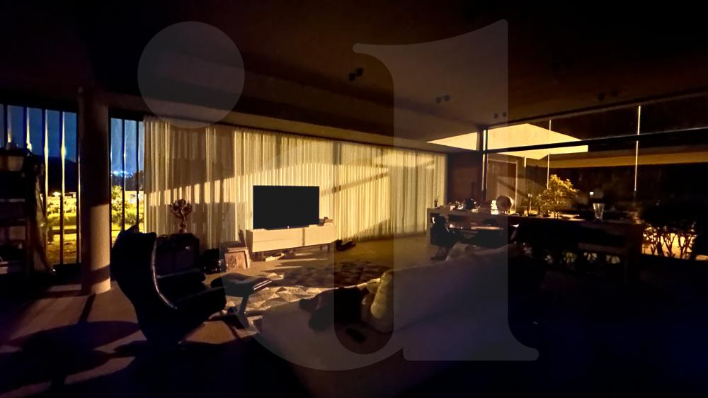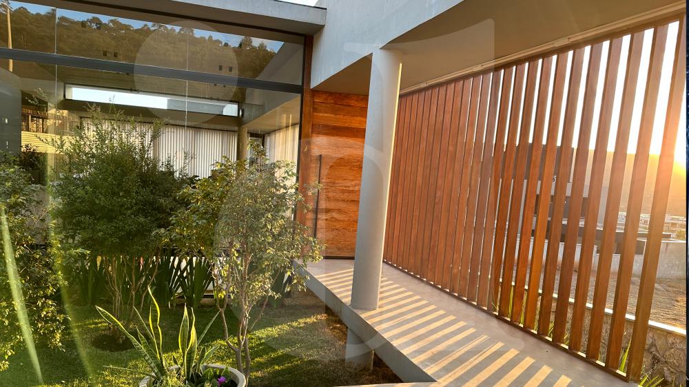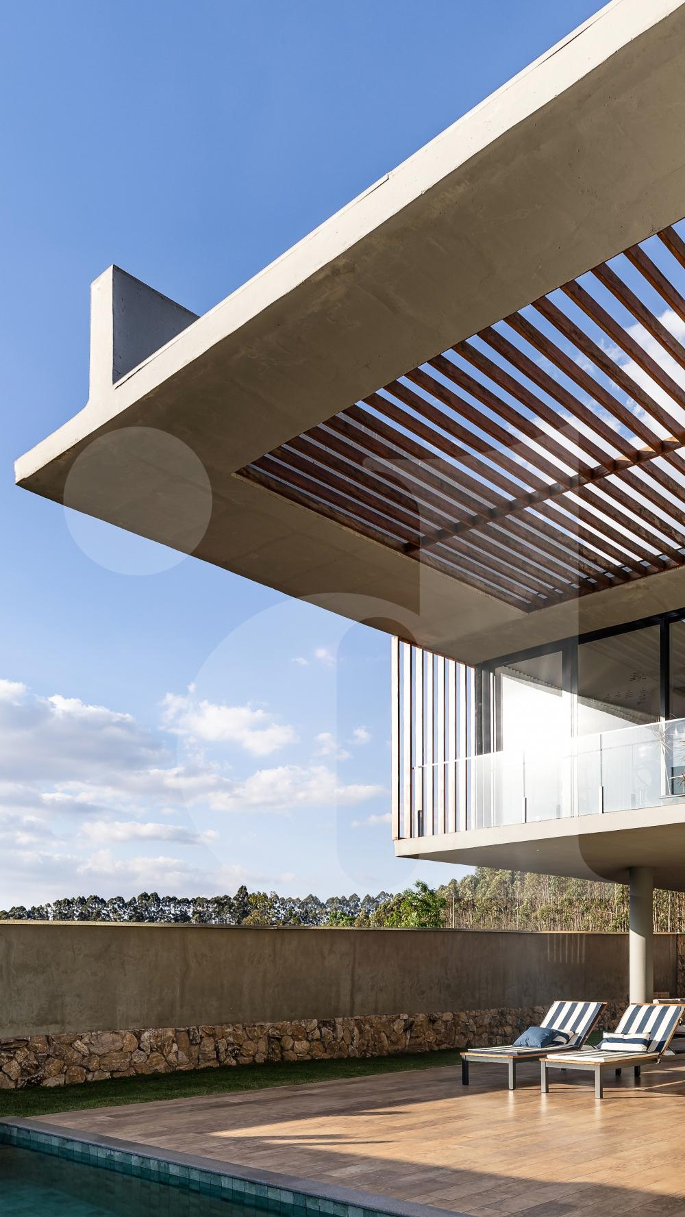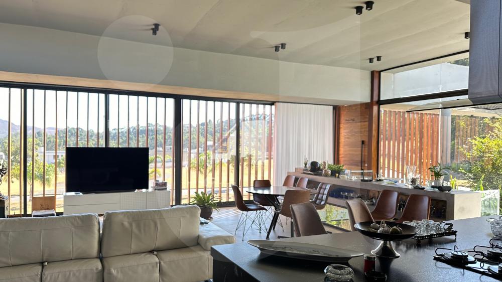 • Sala de perder o fôlego com vista para o nascer e pôr do sol nas montanhas e vista para lagoa cercada com brise em toda a faixada em madeira Garapa. Pé direito alto e iluminação natural. Amplo vão livre em construção de laje protendida de concreto;
